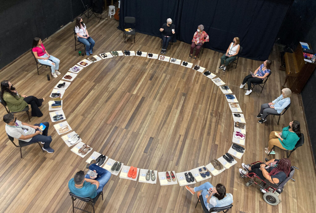 Experiência Interativa Os participantes escolhem e calçam um dos 50 sapatos dispostos em círculo. Cada um recebe um áudio ou vídeo em Libras (no caso de ser uma pessoa com deficiência auditiva) no seu celular, com a história da(o) dona(o) do sapato escolhido relacionada ao tema do cuidado. Os participantes são convidados a calçar, andar com o sapato e se colocar no lugar dessa pessoa.